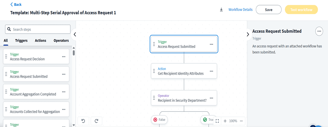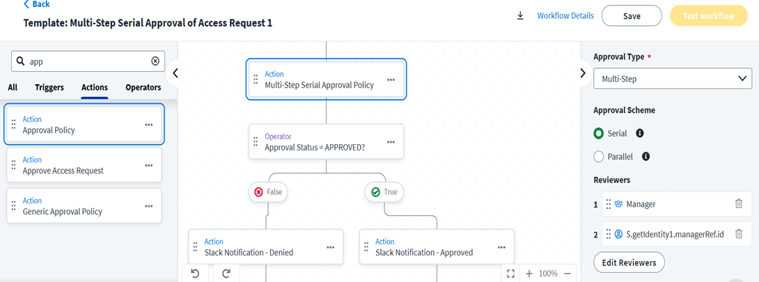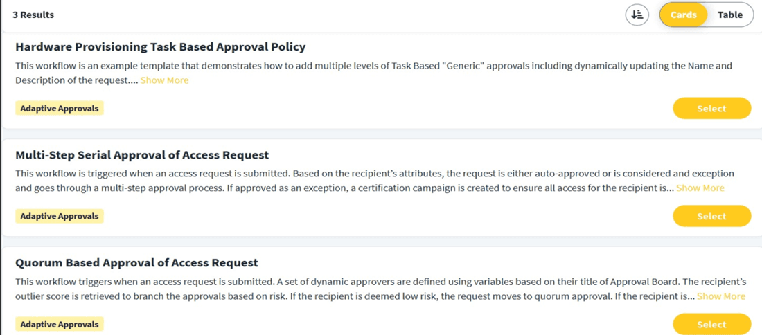 SailPoint offers pre-built Adaptive Approvals workflow templates to assist in getting started with Adaptive Approvals for access request approval policy and generic approval policy.