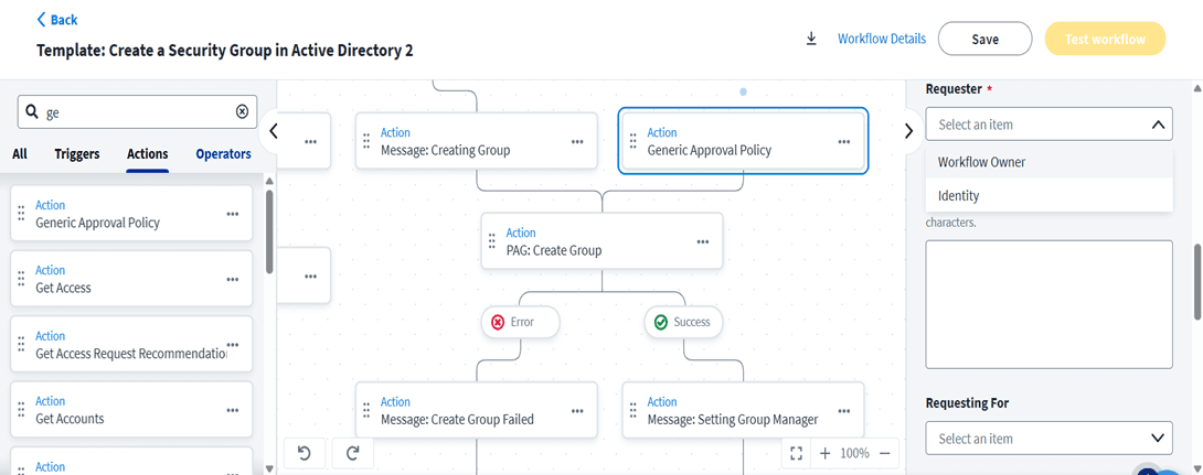 This is used for other task-based items like disabling an account or creating a group in AD. Create a workflow using the Generic Approval Policy action to customize the approval policy.